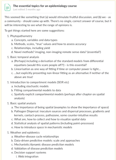 A preliminary list of “Essential Topics for an Epidemiology Course” has been initially proposed by Neil McRoberts in the #teaching channel and was extended with suggestions by other members. If that will ever materialize into an actual book is unknown, but definitely very good ideas are out there. We would love to see a bookdown botanical epidemiology book!