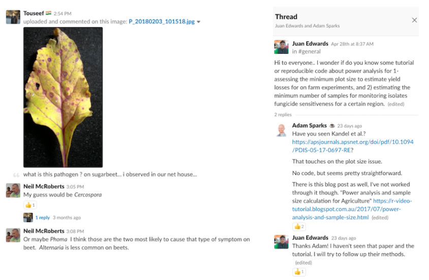 The #general channel is where we expect members posting technical questions of all sorts of plant-pathology related subjects, similar to a discussion mailing list. This has happened but very modestly compared to more general short comments, job announcements, news and discussion of general interest to the group. However, whenever a question is posted, there is always good feedback - see examples below.