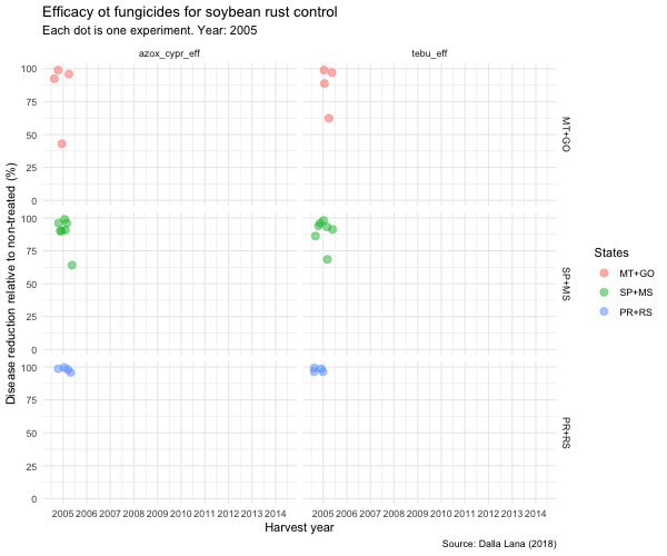 I recently tweeted an animated GIF that depicted the yearly variation in efficacy of tebuconazole, a DMI fungicide, evaluated in field trials, for the control of soybean rust in a major soybean region of Brazil (Mato Grosso state). The Tweet got a lot of attention, not only because of the important issue, but I think also because of the nice way to visualize the data. So I decided to share the R code use to produce the animation for others’ presentations.
