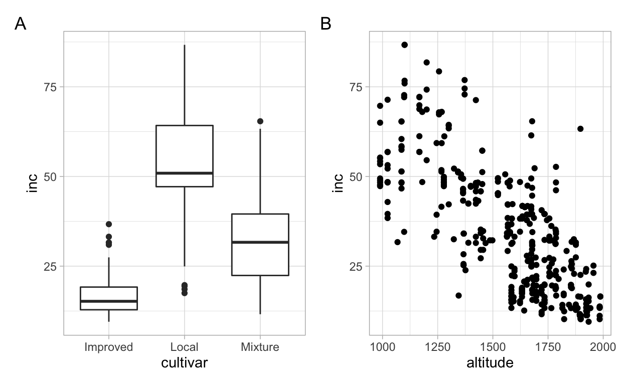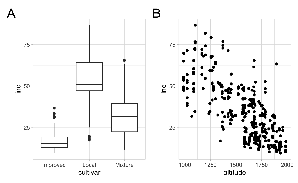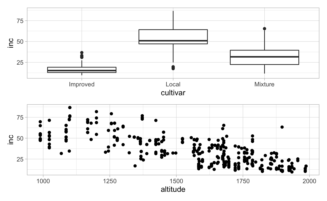 Let’s make two other plots, one for cultivar (factor variable) and other for altitude (numeric variable), relating each with inc. As we did for the first plots, we need to assign each plot to a ggplot object before we can produce the multi panel figure.