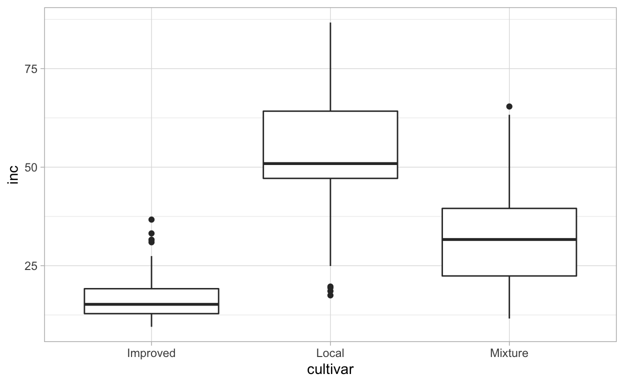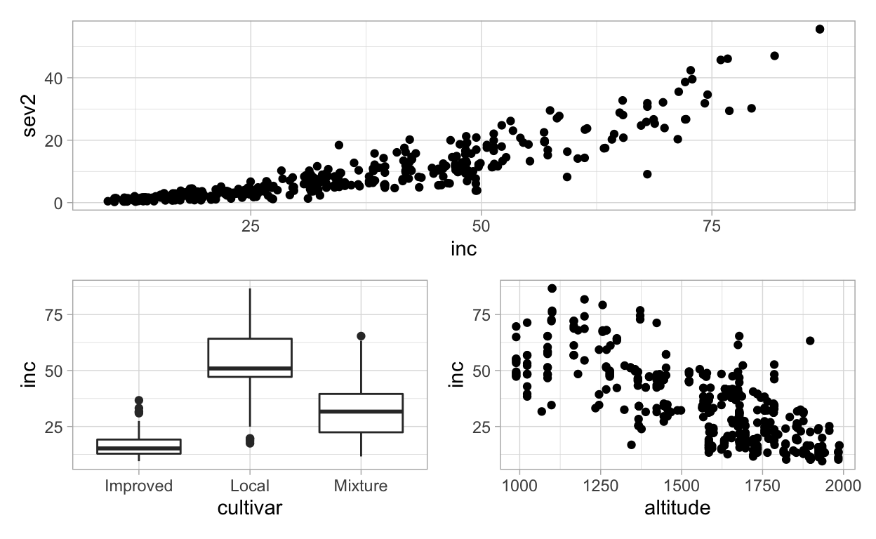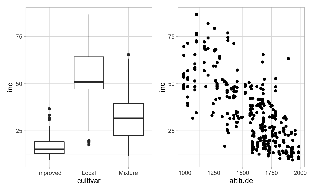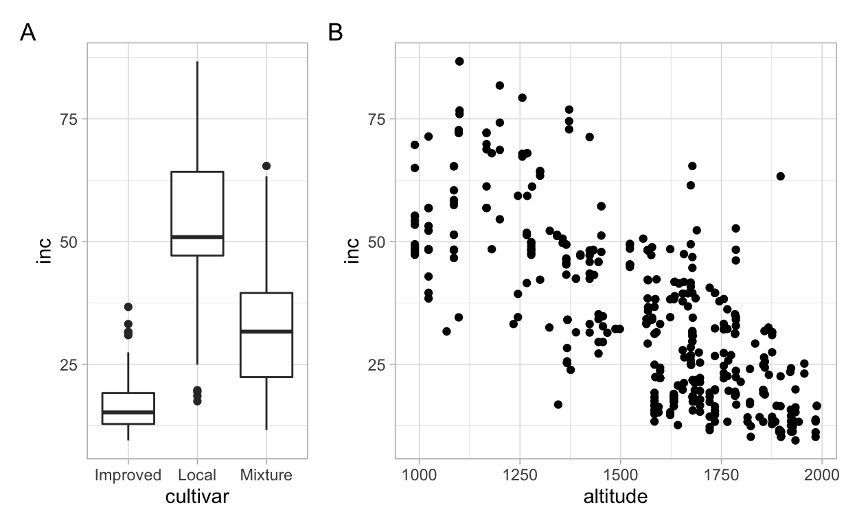 Let’s make two other plots, one for cultivar (factor variable) and other for altitude (numeric variable), relating each with inc. As we did for the first plots, we need to assign each plot to a ggplot object before we can produce the multi panel figure.