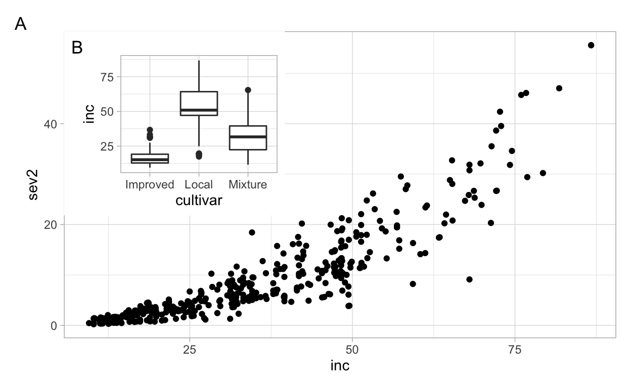 In scientific publishing, it is a good visualization practice to present more than one plot (graph, chart or images) in the same figure, not only to improve communication and comparison but also decrease the number of total figures referenced in papers. I use a coffee leaf rust data set to demonstrate how to make these multi panel figures, using the R package patchwork to produce the most common multi panel figures for scientific papers.