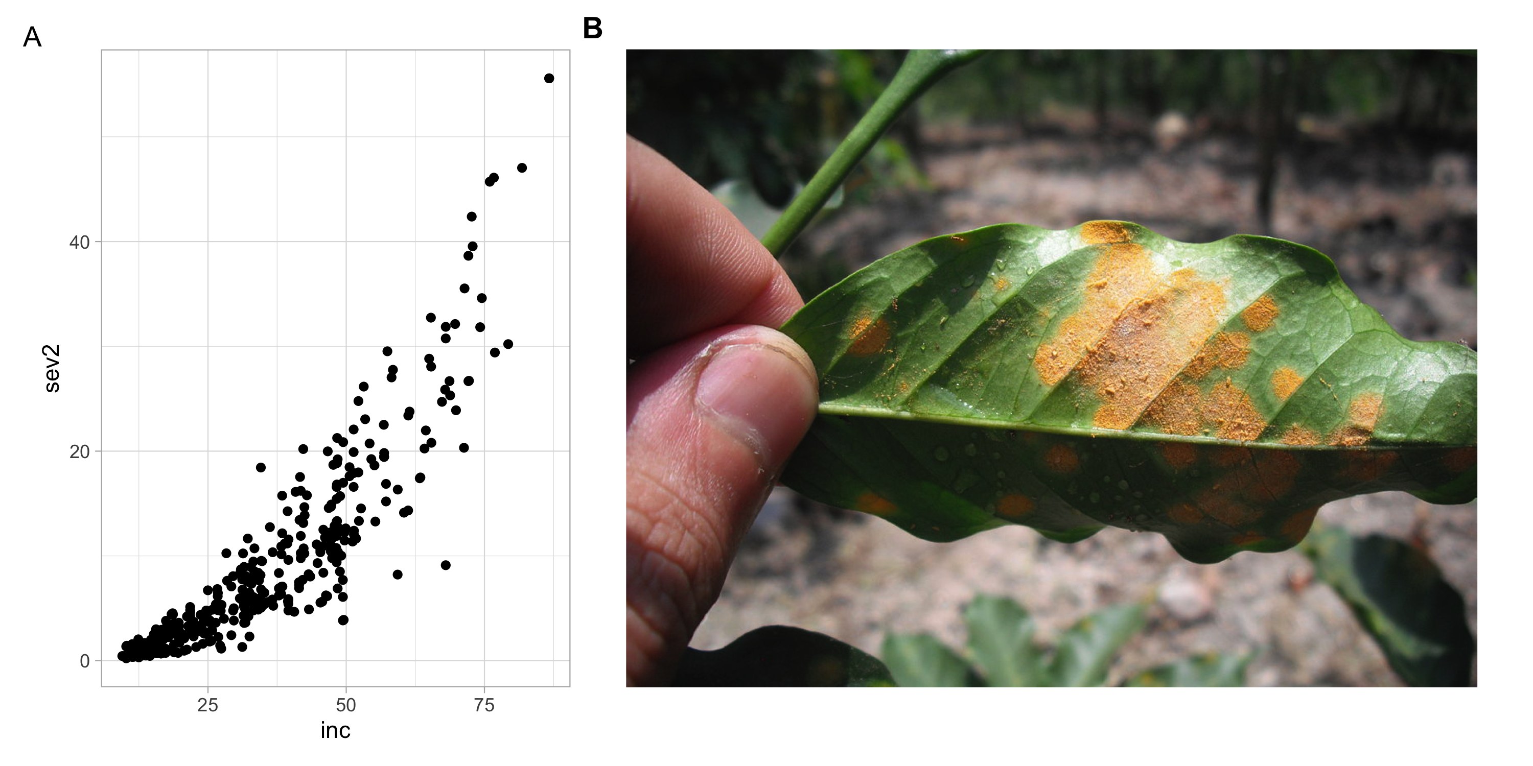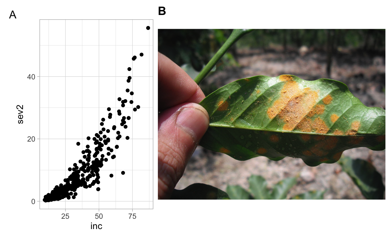 In the mycoffee data frame, there are two coffee rust-related variables (responses) of interest for our investigation, inc and sev2, incidence and severity, both are measured as a percentage; and there is a strong association between them.