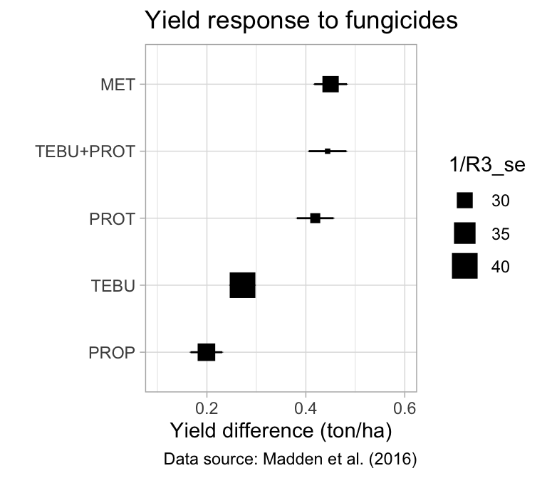 With the results in hand, a dot and error plot with treatments ordered from highest to lowest yield difference is a nice way to visualize the results - not identical but similar to a traditional forest plots. For such, we make the size of the dots proportional to the inverse of the standard error.