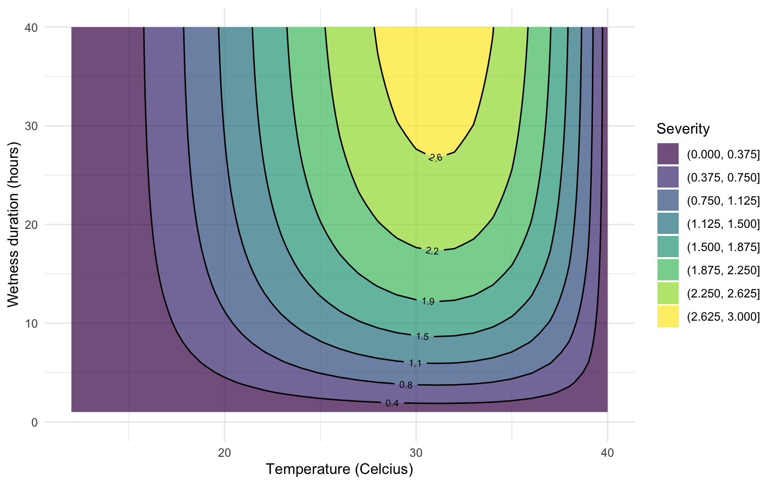 labs(y = "Wetness duration (hours)", fill = "Severity", x = "Temperature (Celcius)")