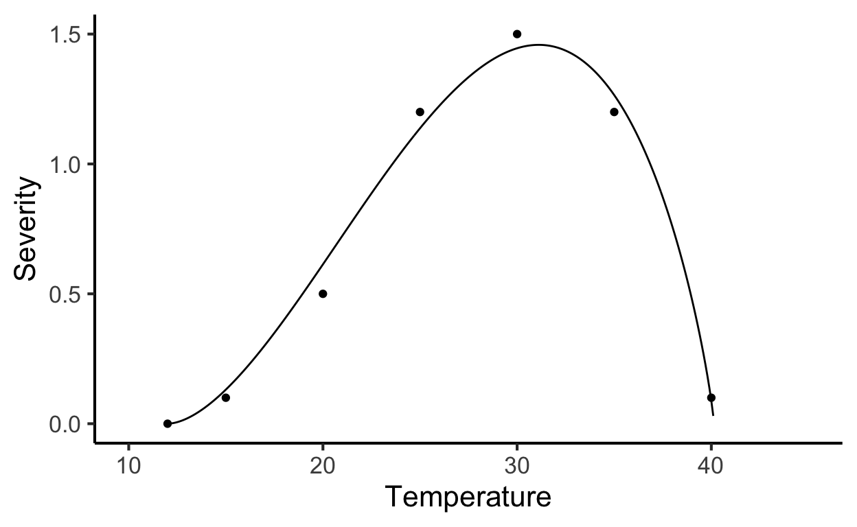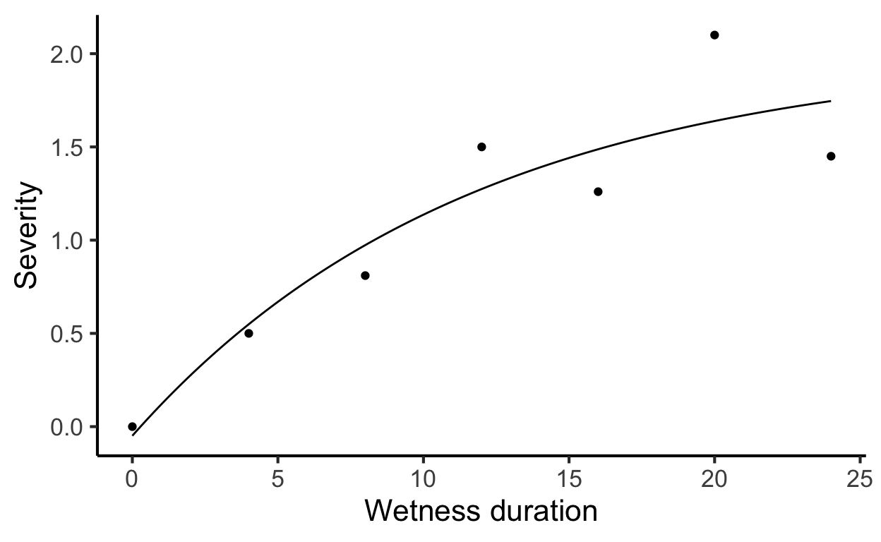 Here, we will fit a Beta generalized model (Hau and Kranz 1990) to data on the response to temperature and an asymptotic regression model to data on the response to wetness duration. The integration of the two models can be used to develop contour or surface-response plots.