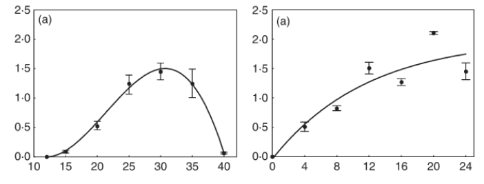 The data used here is only for severity on the cultivar Hamlin. The mean value was extracted from Figures 1 and 2 (see below). The left plot is for the response to temperature and the right plot is for the response wetness duration. The response is severity of infection.